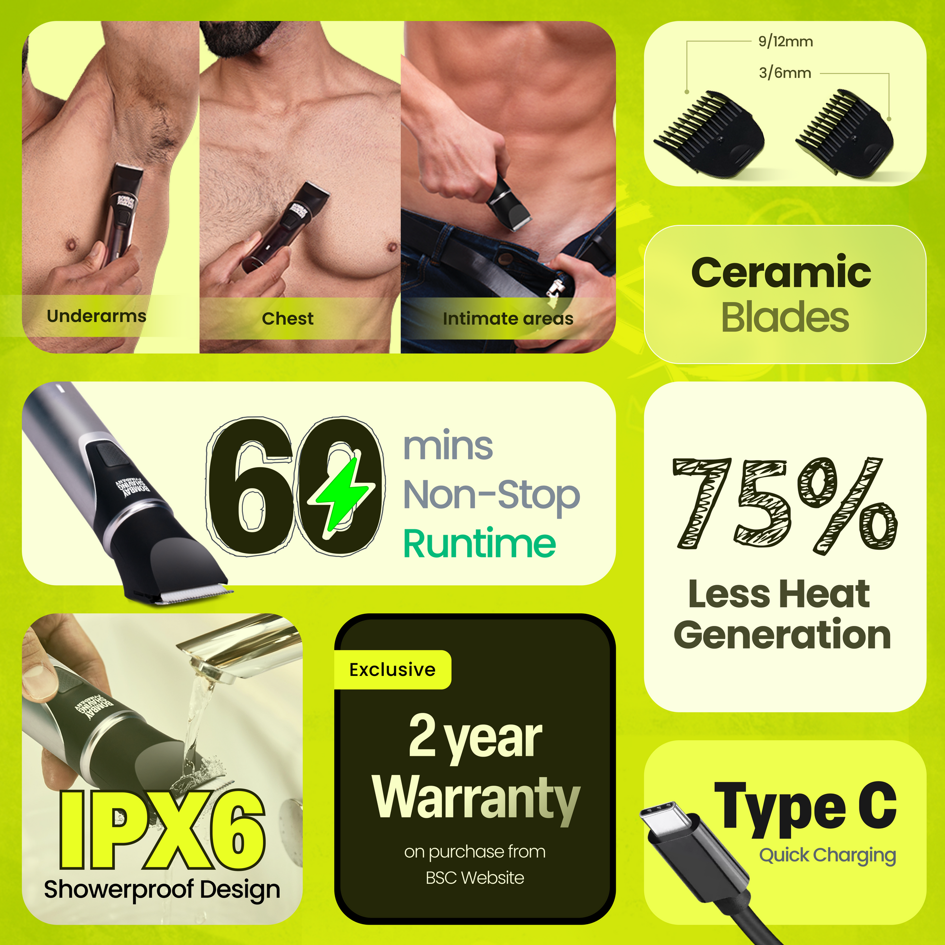 Safe-on-skin ceramic blade in a trimmer that runs for 60 mins on a quick C-type charge. Flex your inner spirit. Khul Ke Khel.