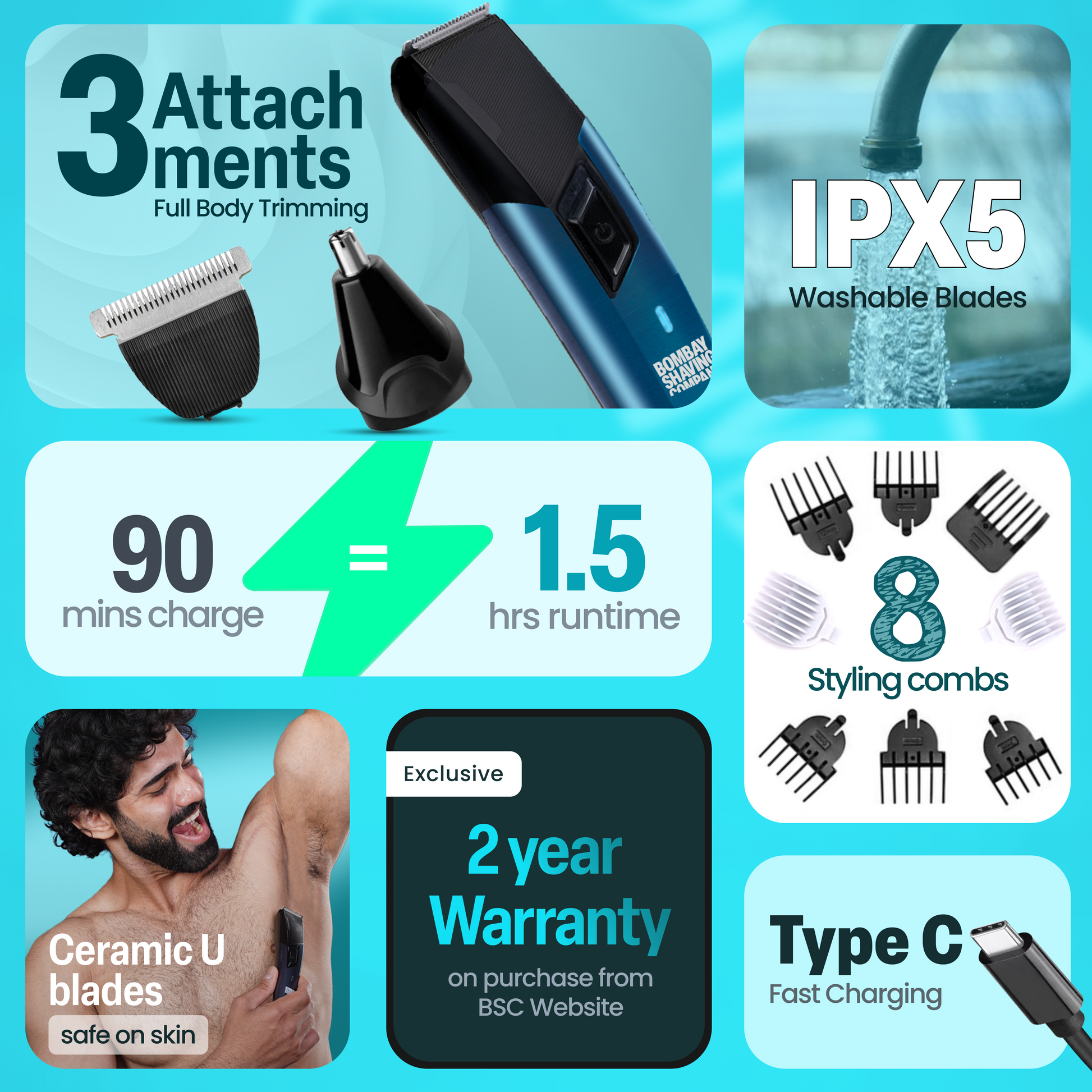 - Comprehensive Trimming for the Whole Body: with 6 styling combs for your beard, 2 for your body and a nose & ears attachment for a neat finish.